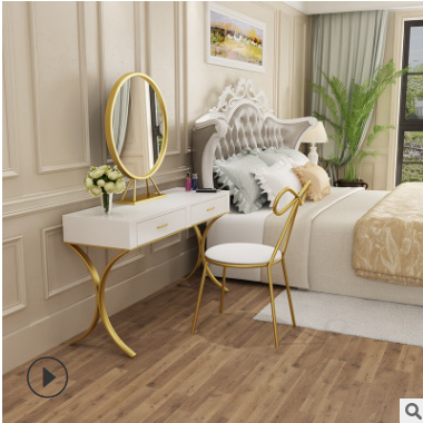 » 北歐實木梳妝臺 ins風(fēng)女生臥室化妝桌創(chuàng)意金色鐵藝帶抽屜化妝臺